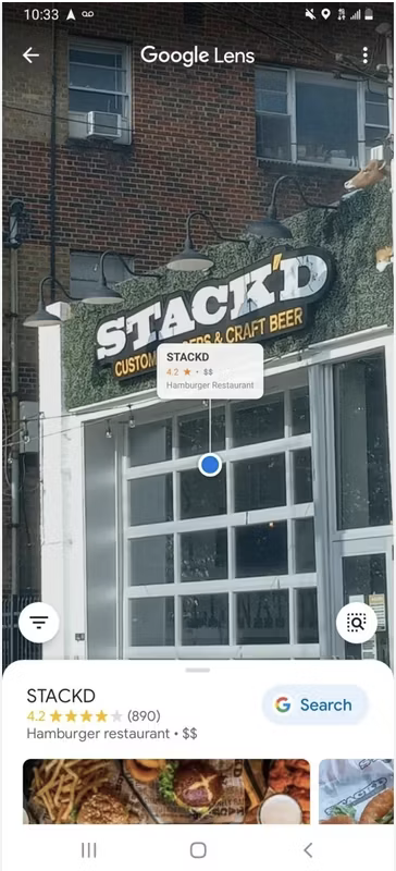Jika Anda sedang melewati kota dan ingin tahu tentang sambungan lokal yang Anda temui, Anda dapat menggunakan aplikasi ini untuk menemukannya secara online dalam hitungan detik. Ambil foto etalase dan pastikan untuk mengaktifkan mode Lokasi aplikasi Lens dengan menekan tombol di dekat bagian bawah dan di sebelah kiri UI.