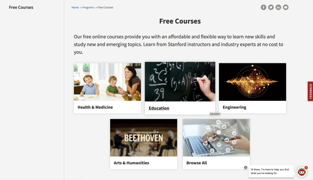 Portal e-learning standford yang menyediakan perkuliahan online gratis dapat diakses melalui tautan https://online.stanford.edu/free-courses