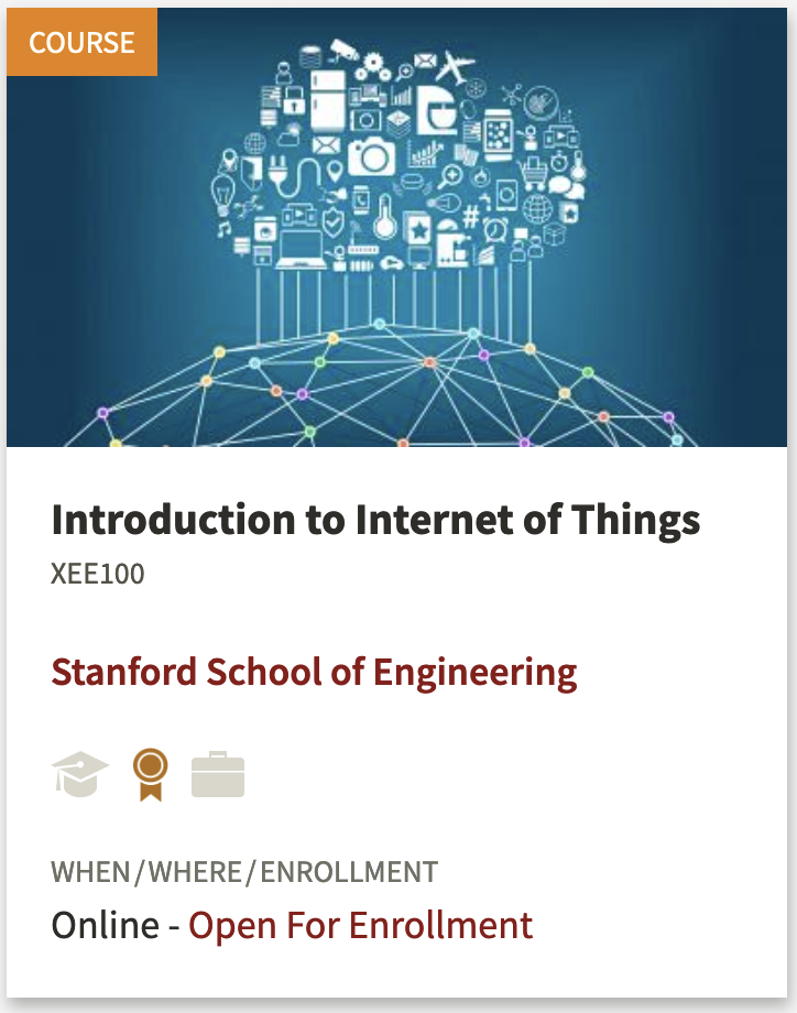 Pada dasarnya hanya perkuliahan berbayar saja yang menyediakan sertifikat, tetapi ada beberapa mata kuliah yang juga menyediakan sertifikat bagi yang telah menyelesaikan perkuliahan sampai akhir. Untuk melihat mana saya perkuliahan yang menyediakan sertifikat kita bisa lihat contoh kuliah online Introduction to Internet of Things, dimana pada tampilan course nya ada tampilan logo lencana seperti berikut