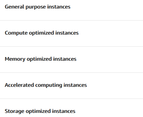 Tipe EC2 bisa dioptimasi untuk kebutuhan yang berbeda. Ketika memilih tipe EC2, kita dapat mempertimbangkan spesifikasi yang dibutuhkan sesuai dengan kebutuhan aplikasi. Kategorisasi EC2 instance dibagi sebagai berikut: