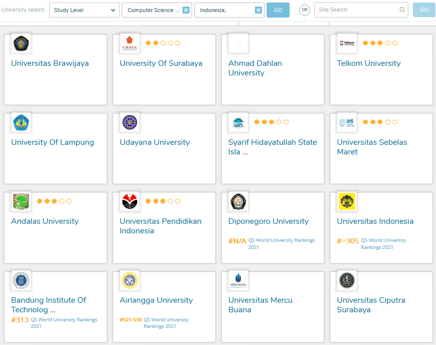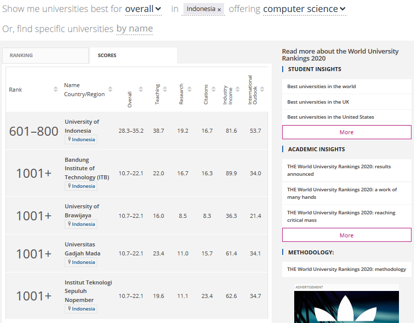 Ataupun melalui https://www.topuniversities.com, sehingga kita dapa melihat daftar universitas terbaik yang menyediakan jurusan yang akan kita tuju sebegai berikut