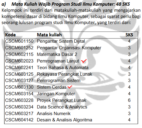 Untuk mengetahui apa saja yang dipelajari pada suatu jurusan kuliah, kita dapat mengakses web universitas dan melihat kurukulum studinya seperti apa. Sebagai contoh di Fakultas Ilmu Komputer universitas indonesia menyediakan informasi mata kuliah yang bisa diambil sebagai berikut:
